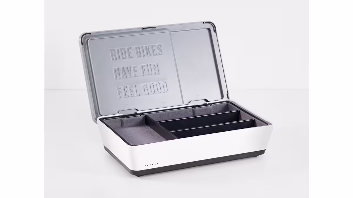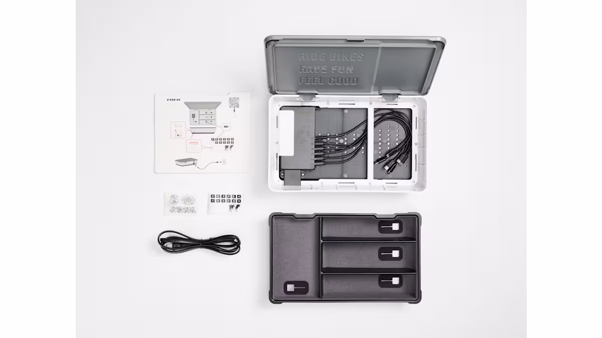 L’estació de càrrega Trek CHRGtime és la millor manera de carregar tots els accessoris de ciclisme. Carrega de forma ordenada fins a sis llums de bicicleta, ciclocomputadors i dispositius en un format refinat que ordena la teva zona de càrrega i que guarda els cables de càrrega USB i microUSB que s’hi inclouen perquè no estiguin a la vista.